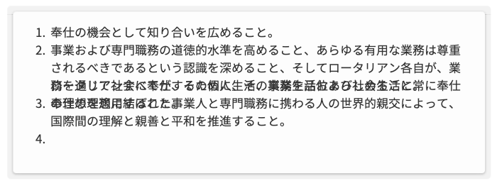 世界中のロータリアンは以下の4つを行動の規範として奉仕活動に取り組んでいます。